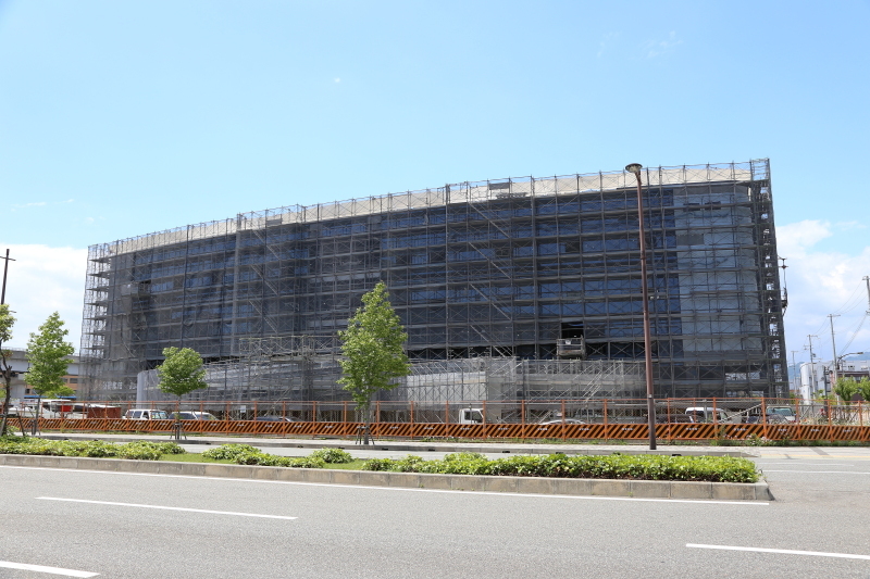 中央が膨らんだ楕円型で鉄骨造の建物にはすでにアルミ/ガラスカーテンウォールの取り付けが進められており、ほぼ建物全面が覆われているようです。