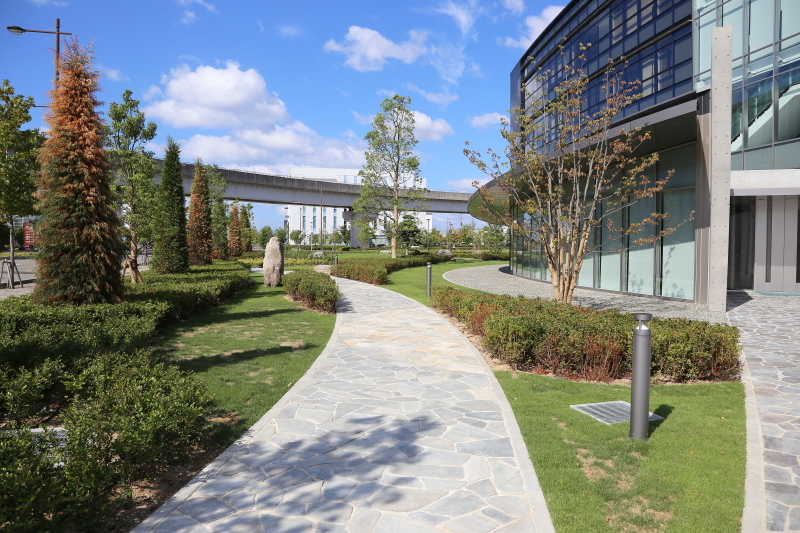 新本社敷地は6,000平方メートルあり、北側を駐車場、南側を庭園と公開空地としています。