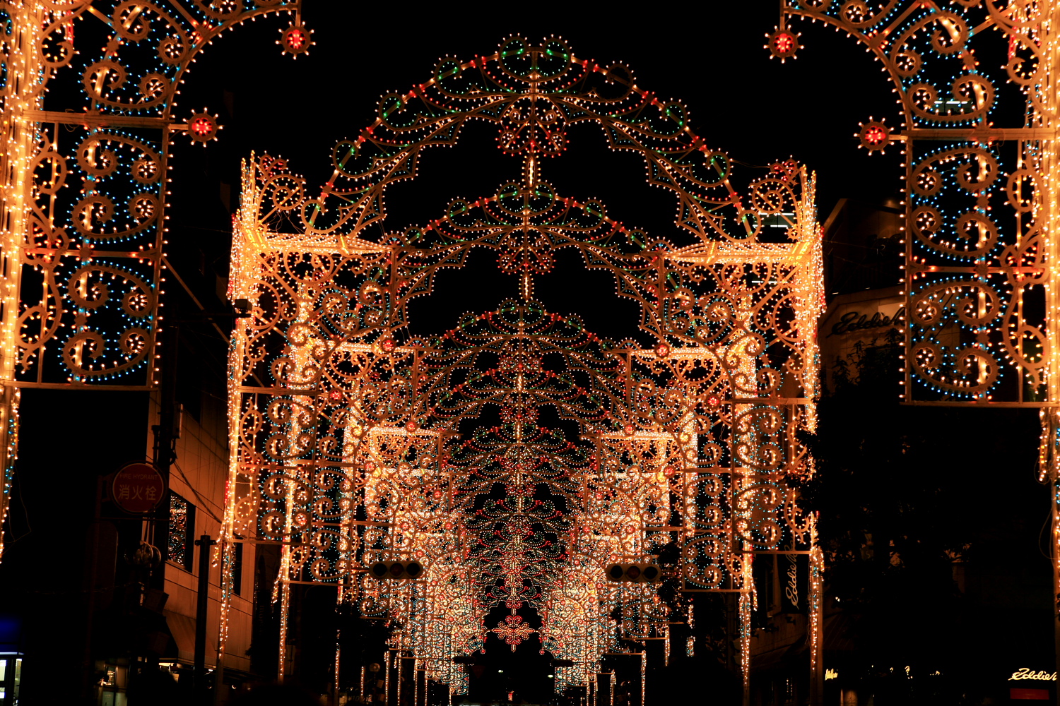 ガレリアは京町筋を越えると各アーチの間隔が狭まり、密集した光の演出によって感動が深まります。/>